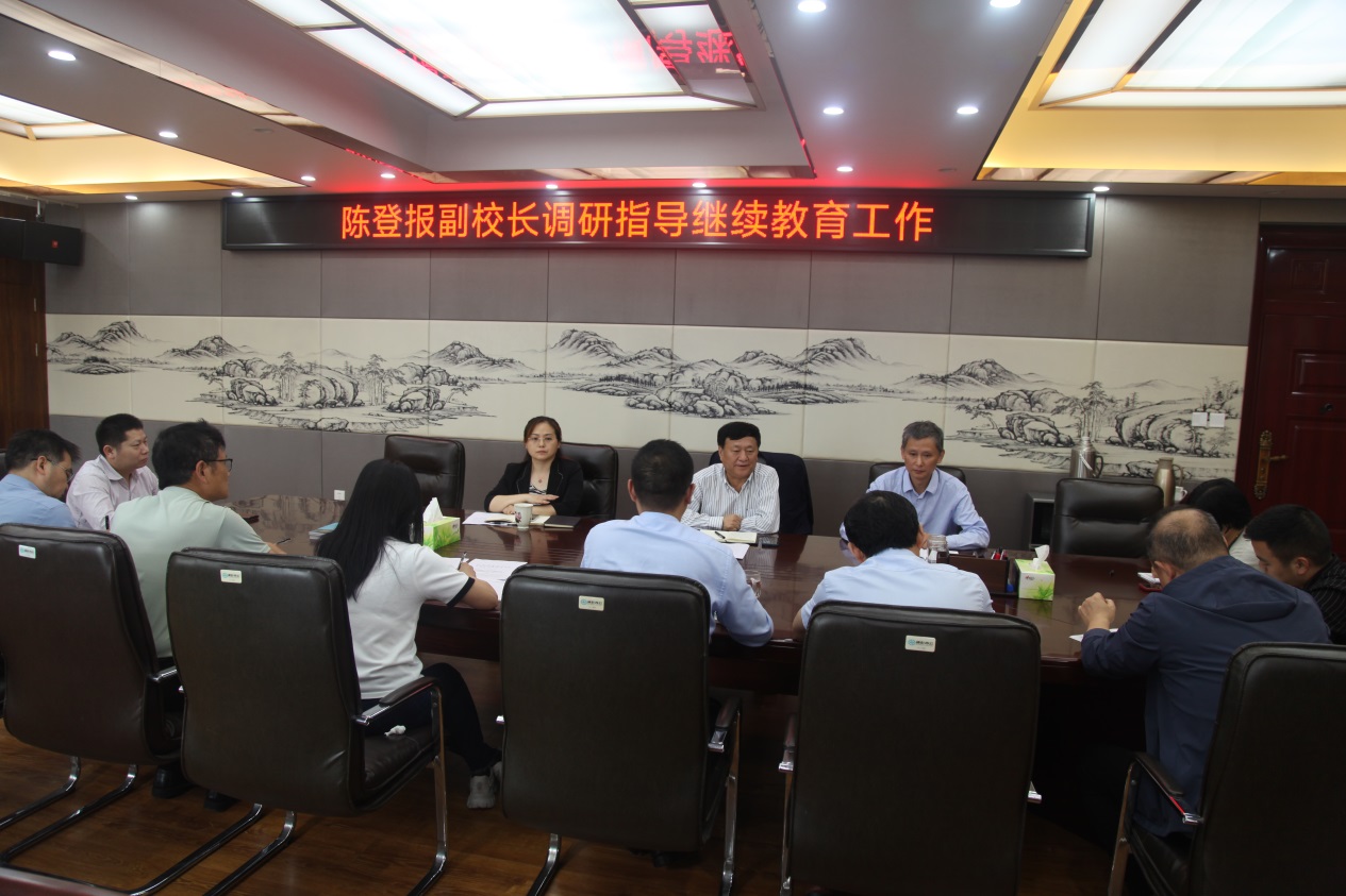 为推动学习贯彻习近平新时代中国特色社会主义思想主题教育走深走实,5月30日下午,副校长陈登报到我院调研指导,聚焦学校继续教育事业高质量发展进行座谈。学院领导班子成员和各科室负责人参会,座谈会由新葡萄官方网院长祝军主持。