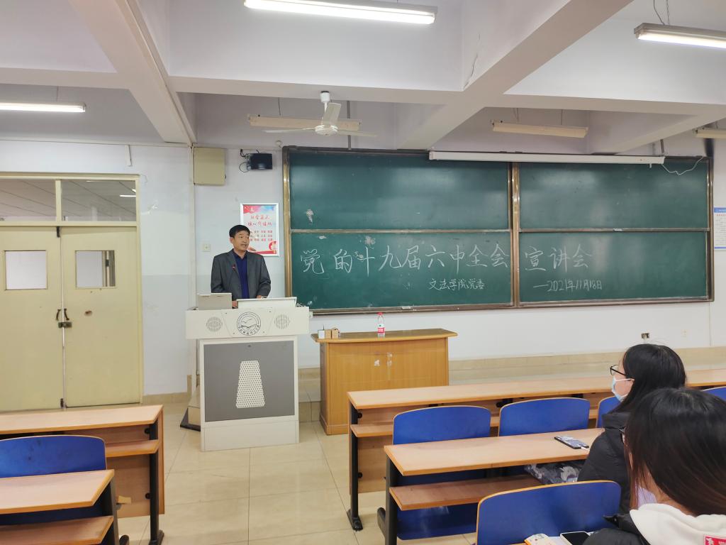 他强调,党的十九届六中全会是在“两个一百年”奋斗目标历史交汇关键节点上召开的一次具有里程碑意义的重要会议。深入学习宣传贯彻党的十九届六中全会精神,是当前和今后一个时期的首要政治任务,全体党员要全面认识、深刻把握十九届六中全会精神,从党的百年奋斗中看清楚过去我们为什么能够成功、弄明白未来我们怎样才能继续成功,全面贯彻党的教育方针,坚守为党育人、为国育才的初心和使命,切实把学习宣传贯彻党的十九届六中全会精神与学习习近平新时代中国特色社会主义思想结合起来,与立德树人根本任务结合起来,谱写学院高质量发展新篇章。