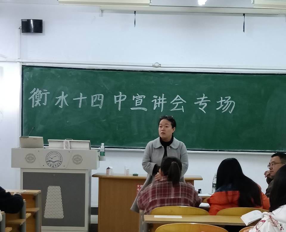 2020年11月1日上午9点,Beat365官方网站在综合楼109教室举办“衡水市第十四中学专场宣讲会”,20多名毕业生参加了此次宣讲会。宣讲会上,衡水市第十四中学的校长首先介绍了学校的总体情况,衡水十四中是桃城区唯一一所重点国办高中,2016年跻身“全国百强中学”,办学水平位居河北省前列,同时对毕业生普遍关心的工资待遇和保险问题也进行了详细讲解。随后,每位毕业生做了十分钟的试讲,在试讲中自信从容,顺畅流利。校方领导和老师对毕业生的表现给予了高度肯定,并在讲课思路、板书设计等方面提出建议。最后,单位负责人告知毕业生及时关注面试结果,收到消息后再到学校进行最终面试。
