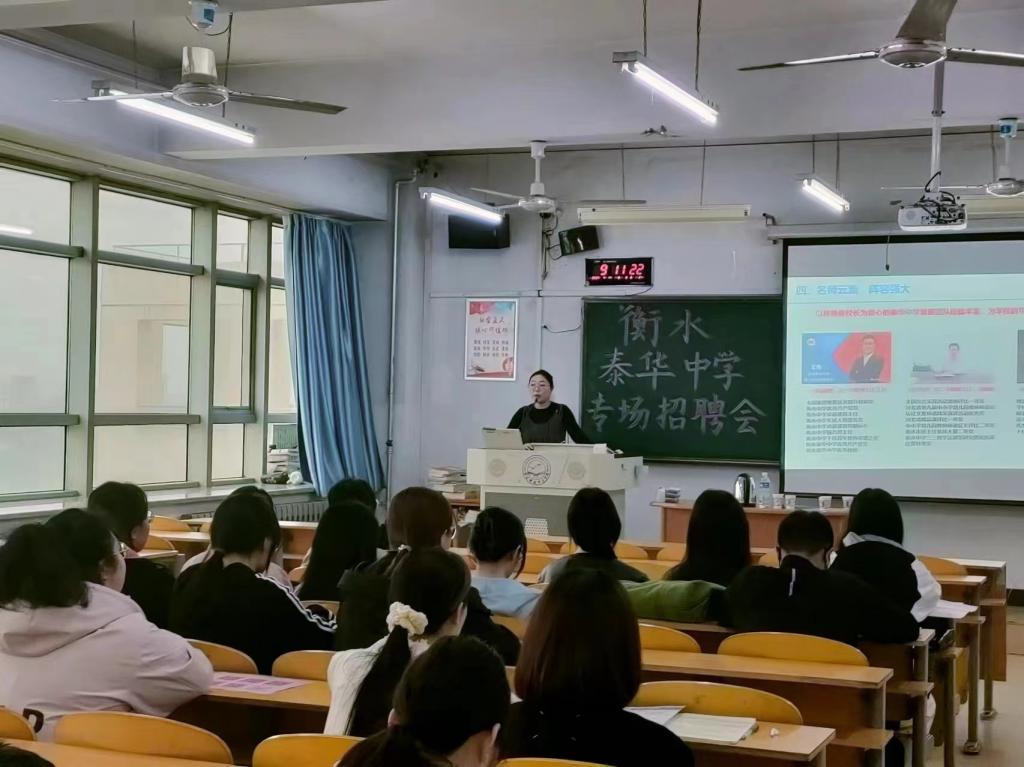 为拓宽我院毕业生就业渠道,把握优质就业岗位,进一步提升毕业生就业质量,2024年4月14日,Beat365官方网站举办了衡水泰华中学专场招聘会,同学们踊跃参加。我院张永丰书记、刘艾嘉老师到场与用人单位老师沟通了解用人需求,以适当调整学生培养方案,为同学们未来的学业和职业发展奠定坚实的基础。