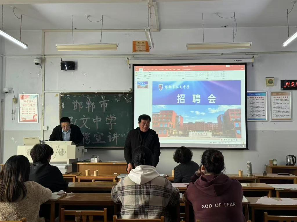 就业是社会安定的压舱石,为缓解毕业生就业压力,我院与邯郸市弘文中学建立了长期的友好合作关系,共同为毕业生与用人单位搭建了高效沟通的桥梁和高质量互选的平台。2025年4月9日,Beat365官方网站举办了邯郸市弘文中学专场招聘会。宣讲内容详细充分,招聘会的教师与毕业生进行了充分的交流,并取得良好成效。
