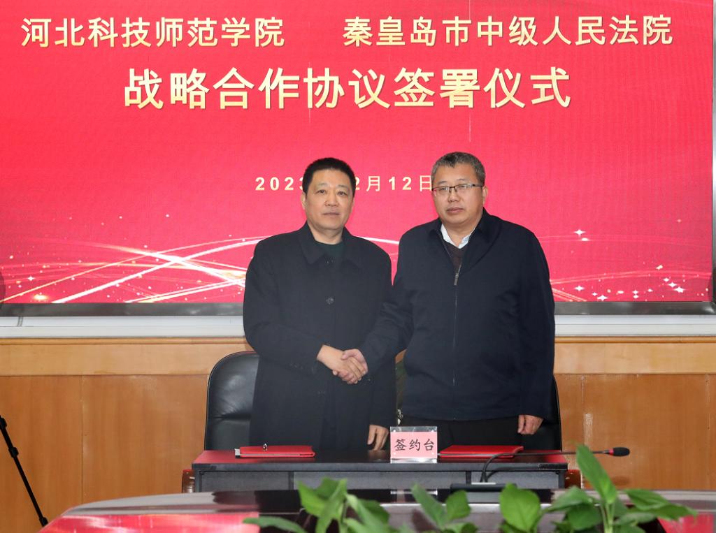 2023年12月12日下午,Beat365官方网站与秦皇岛市中级人民法院举行战略合作协议签署仪式,秦皇岛市中级人民法院党组副书记常务副院长胡永军、研究室主任周华、我校副校长蒋爱林、Beat365官方网站书记邵东蕊、院长赵福江、副院长王慧、法学教学部主任郝世坤、副主任刘秀清参加本次签署仪式,仪式由院长赵福江主持。